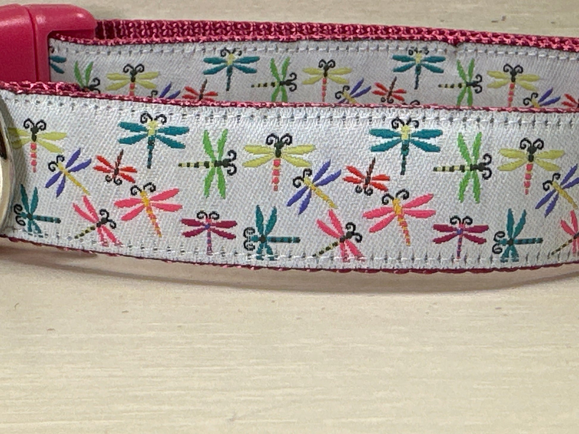 Dragonflies take flight across this vibrant dog collar, bringing summer's most enchanting insects to life. Featuring a cheerful parade of dragonflies in every color imaginable—brilliant blues, shimmering greens, sunny yellows, and more—set against a crisp white background. Perfect for pups who love the outdoors and owners who appreciate nature-inspired style. This playful design captures the magic of warm-weather adventures, making every walk feel like a journey through a sunlit garden. Adjustable fit ensures comfort for dogs of all sizes.