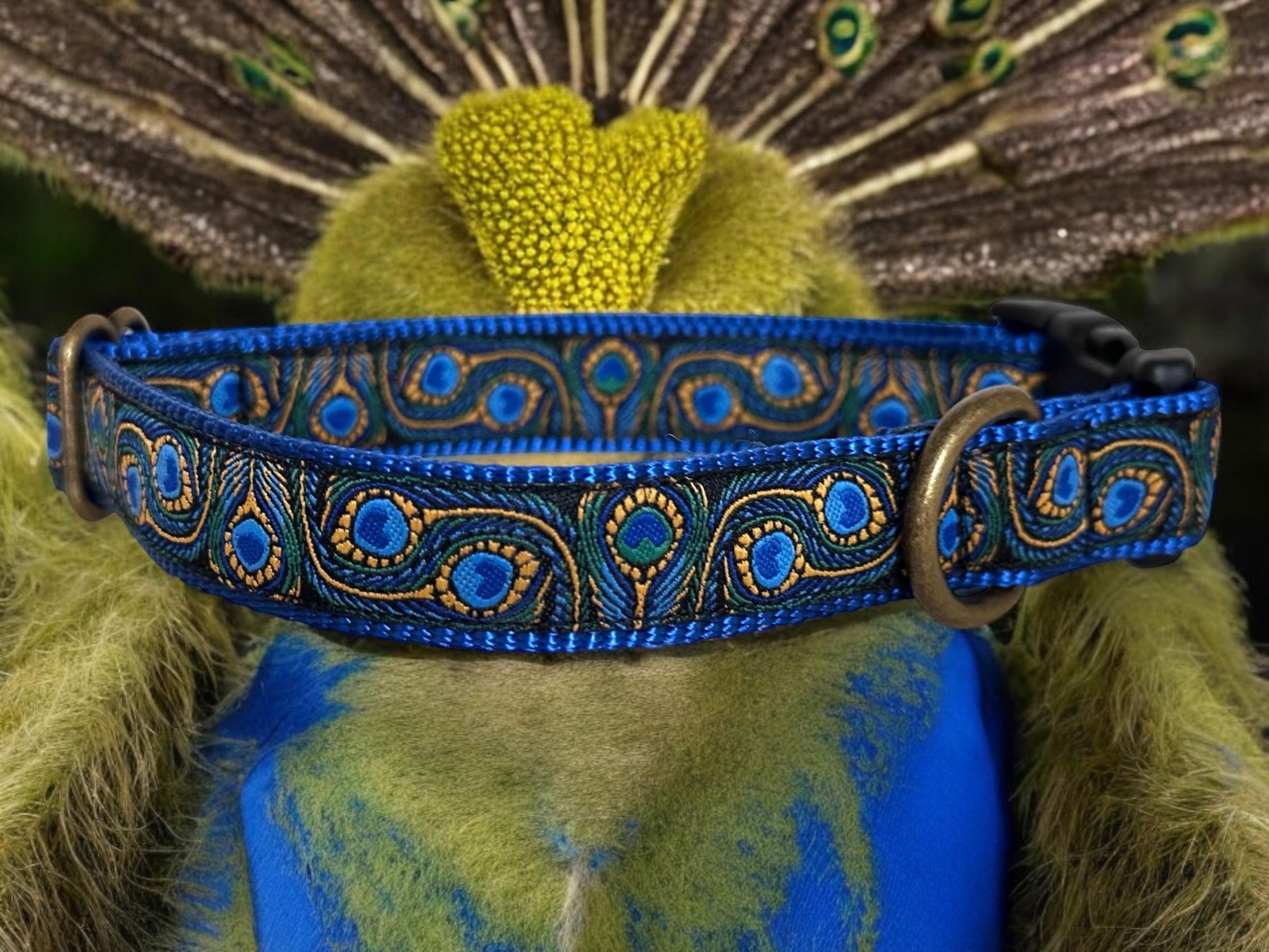 Elevate your pup's style with our Peacock Feather Dog Collar, featuring a stunning iridescent peacock pattern that catches the light beautifully. Crafted with premium materials and meticulous attention to detail, this collar combines luxury aesthetics with everyday durability. Perfect for dogs who deserve to turn heads on every walk. Customize with an engraved buckle to make it truly one-of-a-kind.